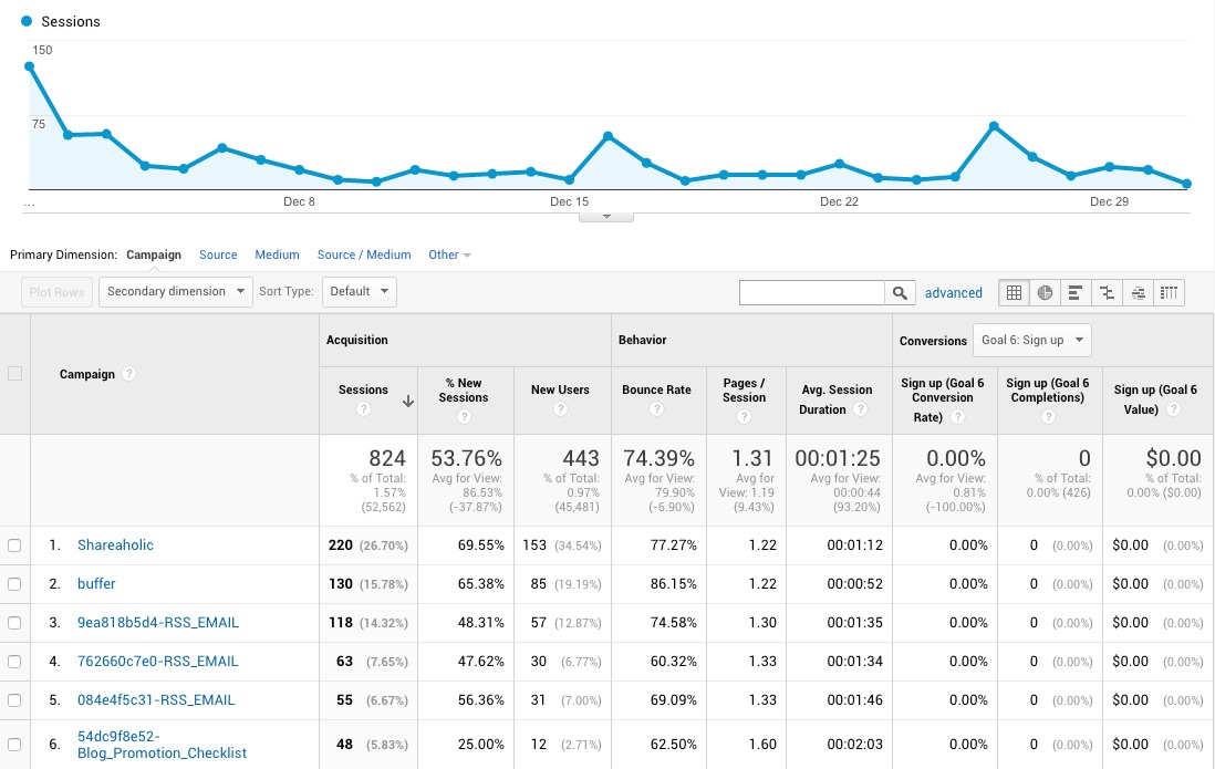 In my case, the most common campaigns are emails that I send out, as well as social shares using my social sharing buttons from Shareaholic.