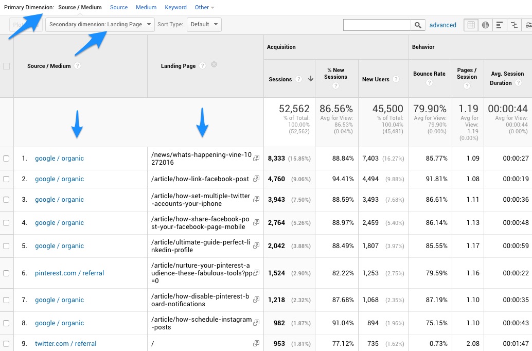 For instance, you could look at a report like Source / Medium which shows the kinds of sites that your website traffic has come from (e.g., Google / Organic), and add a secondary dimension for Landing Page to see where that traffic went from your top sources.