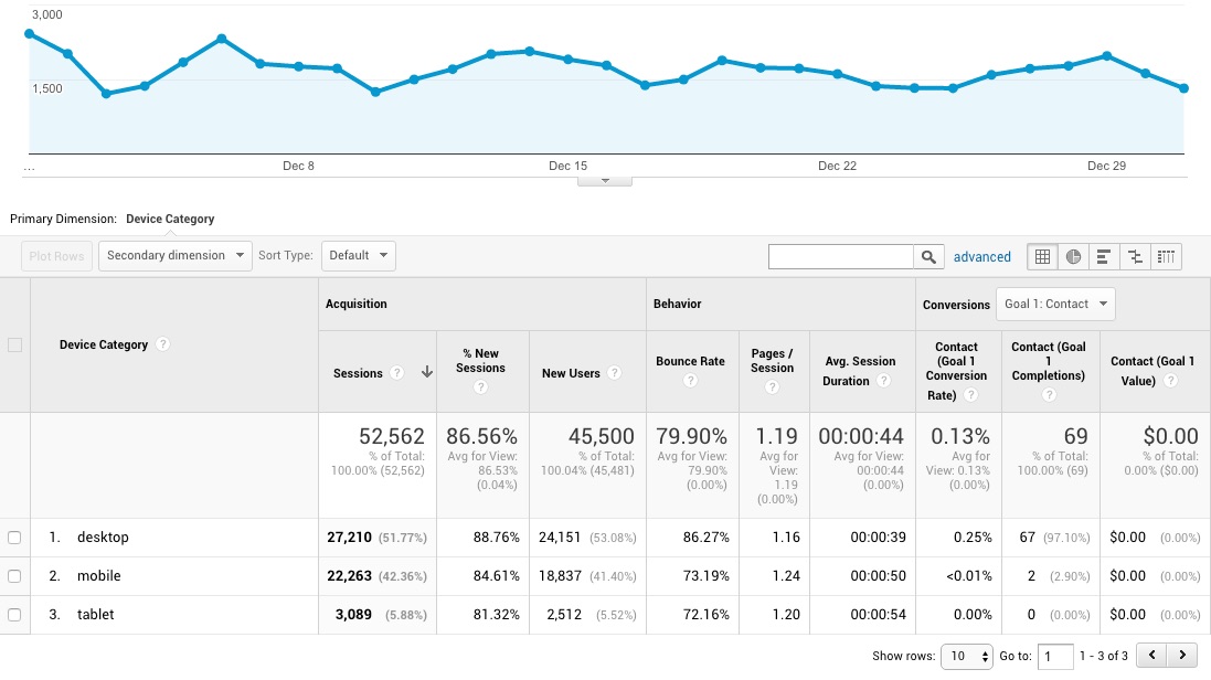 First, look to see if there are major discrepancies in Behavior or Conversion between different devices. You can select different Goals to see how each performed, and determine if more work needs to be done for mobile or tablet users to help them better complete that task.