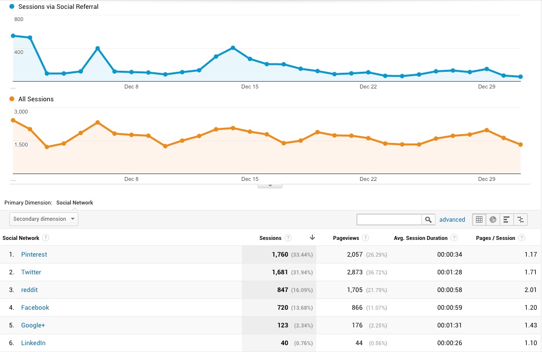 In this example you can see that Google / Organic continued to be my #1 driver of traffic in December, and that Pinterest and Twitter were my top social sources.