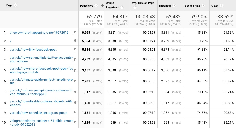 In my case, the results are a mix of recently trending news stories (e.g., Vine closing) alongside well-performing guides and articles. (You’ll get used to reading URL “slugs” -— the text in a page’s address that comes after your root domain name — when looking at these reports.)