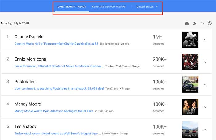 Remember that for both “Daily Search Trends” and “Real-Time Search Trends,” you can change country. This is useful for targeting content more accurately to wherever your audience is.