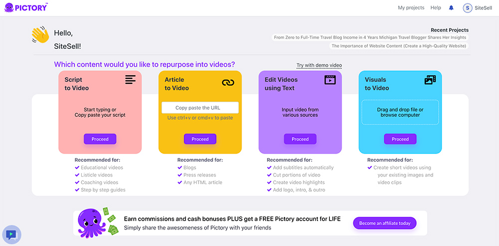 The tool summarizes your article and pulls out key messages (that you can later edit/reword if you want), then chooses video from a stock library that corresponds to the content.