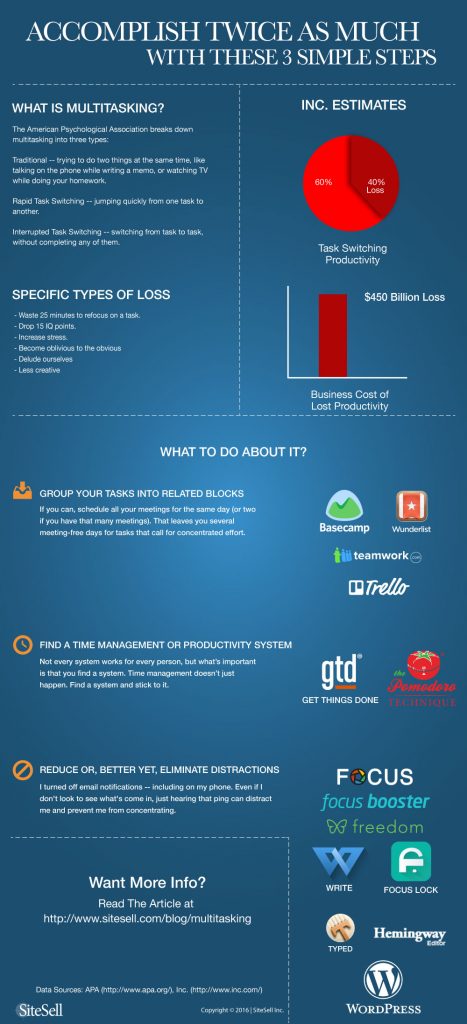 Inc. estimates the business cost of lost productivity due to these forms of multitasking at $450 billion. Yes, that’s billion with a “B.” Experts estimate task switching causes a 40% loss in productivity.