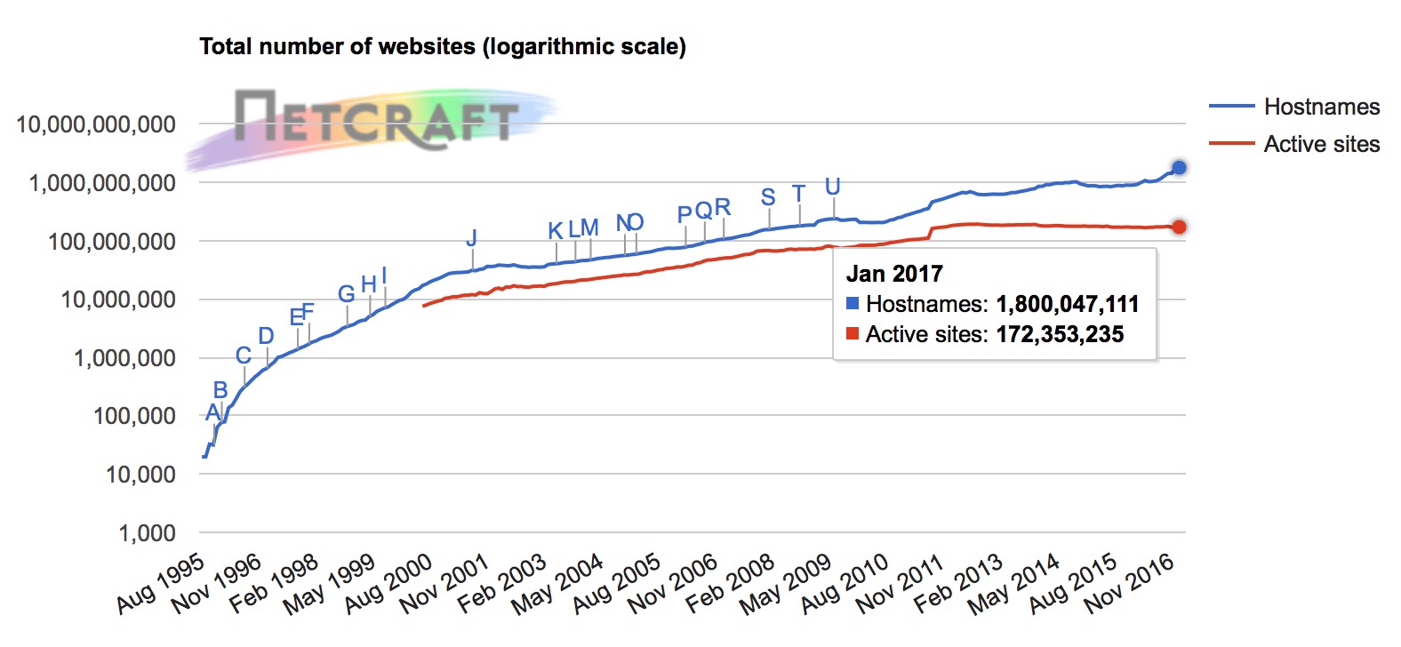 According to Netcraft, the authority in this field, there are 173 million active sites today. You can see that the number has been flat for years, indicating churn. Most of these are “fails” being replaced by new players. Hopefully, some are folks trying again a second or third time (the first is often the learning curve)…